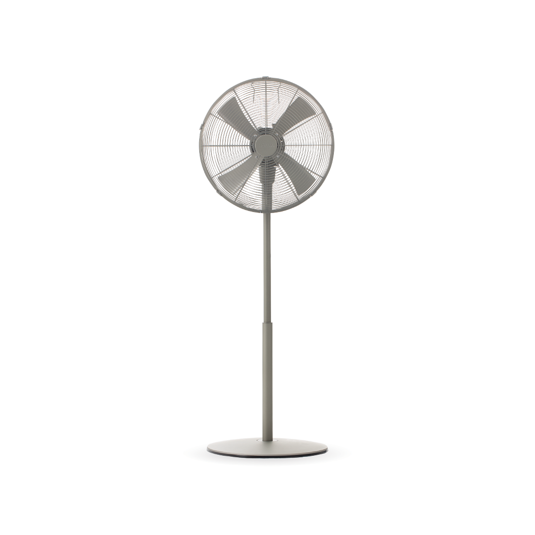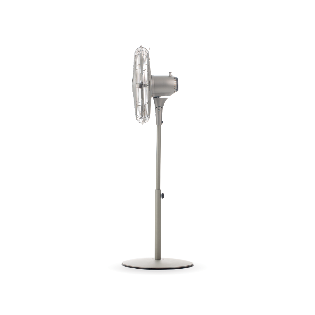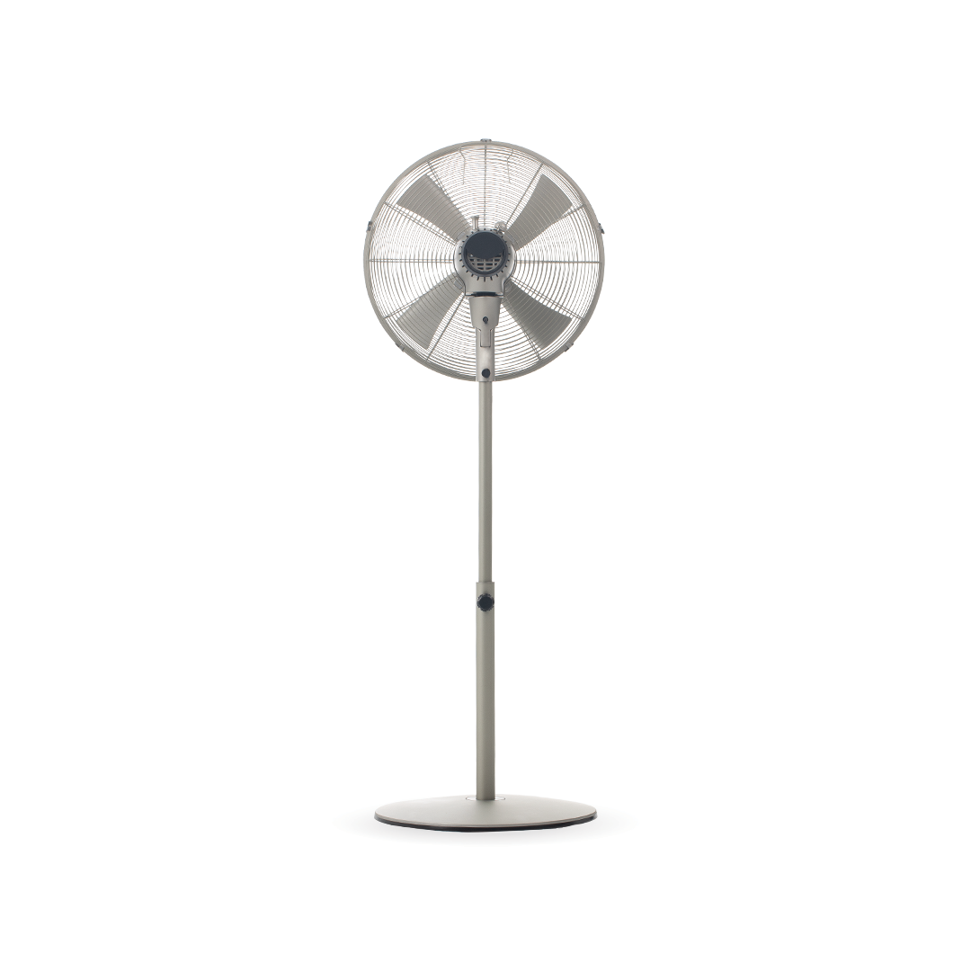 The silver 16-inch standing fan has a sturdy frame that generates strong air distribution.